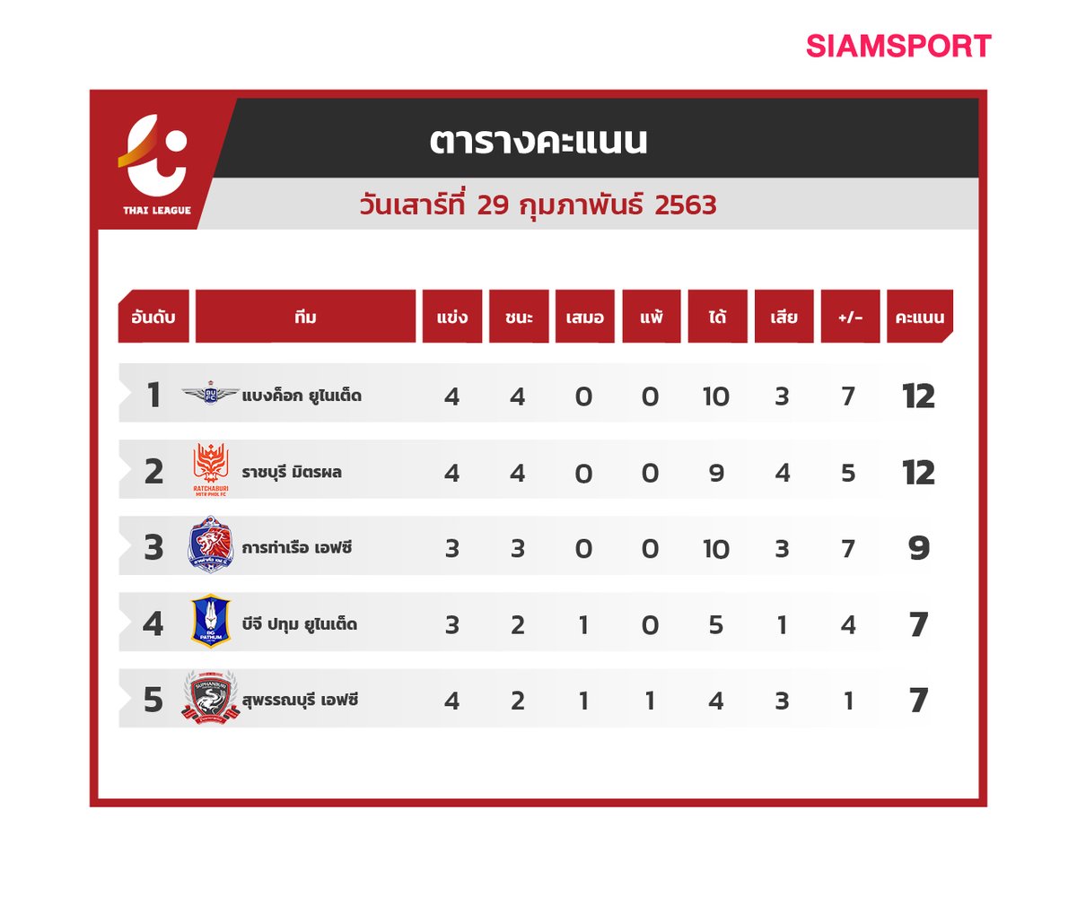 Siamsportnews No Twitter ตารางคะแนนไทยล ก 5 อ นด บแรก หล งจบเกมประจำว นเสาร 29 ก พ 63