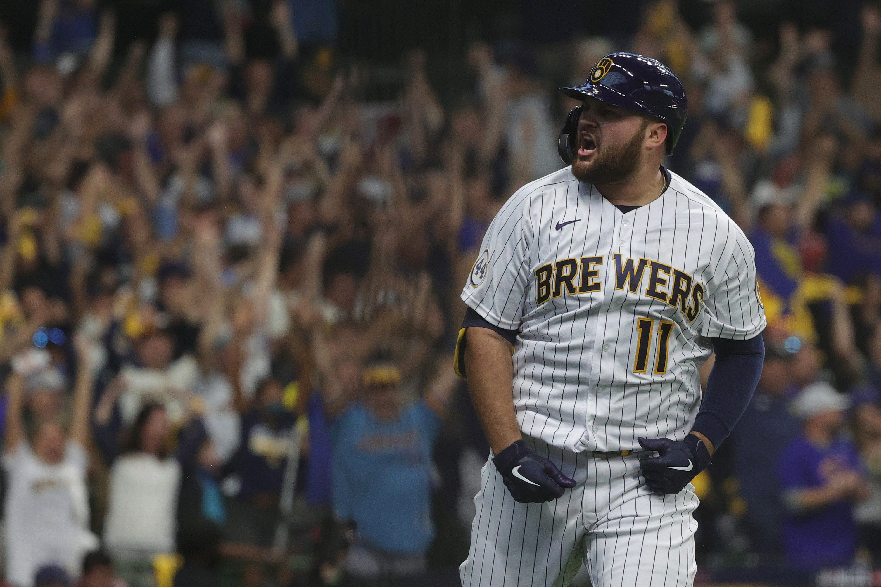 Milwaukee Brewers Rowdy Tellez celebrates a two-run home run with Willy Adames during the seventh inning in Game 1 of baseballs National League Divisional Series against the Atlanta Braves Friday Oct. Milwaukee Brewers Rowdy Tellez watches his two-run home run during the seventh inning in Game 1 of baseballs National League Divisional Series against the Atlanta Braves Friday Oct. First pitch at 337 pm.
